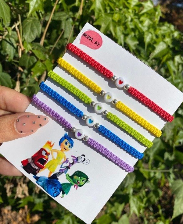 Pulseras de macramé con dije corazón de plástico, son regulables, tienen un nudo corredizo para ajustarla a la muñeca.