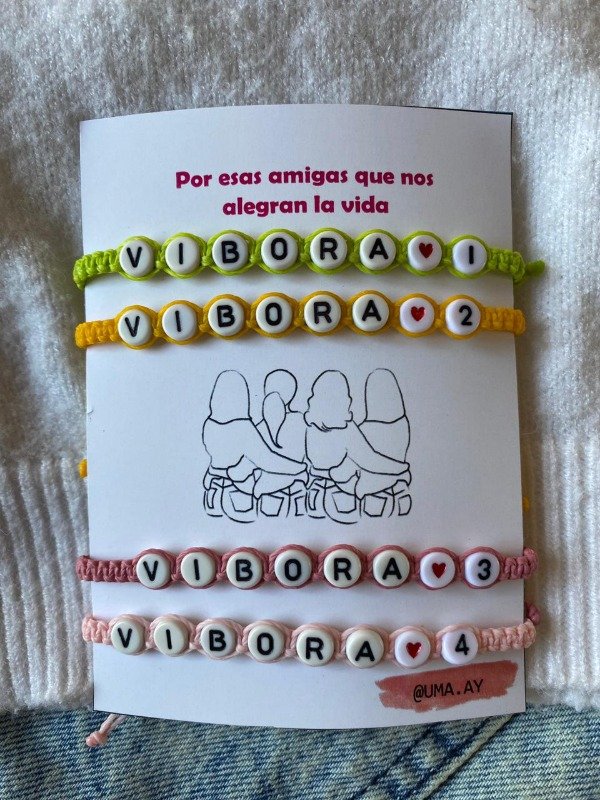 Pulseras de macramé, con letras de plástico, las pulseras son regulables, tienen un nudo corredizo parar ajustarla a la muñeca.