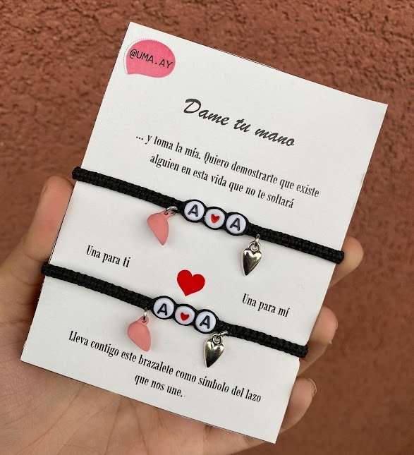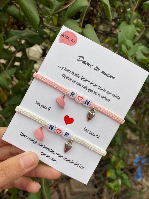Pulseras de macramé con dije de fundición, letras de plástico e imán engomado, las pulseras son regulables, tienen un nudo corredizo para ajustar las pulseras a la muñeca.